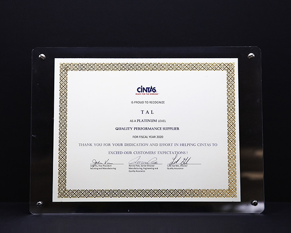 Awarded to TAL Apparel in appreciation for our outstanding collabration and efforts.