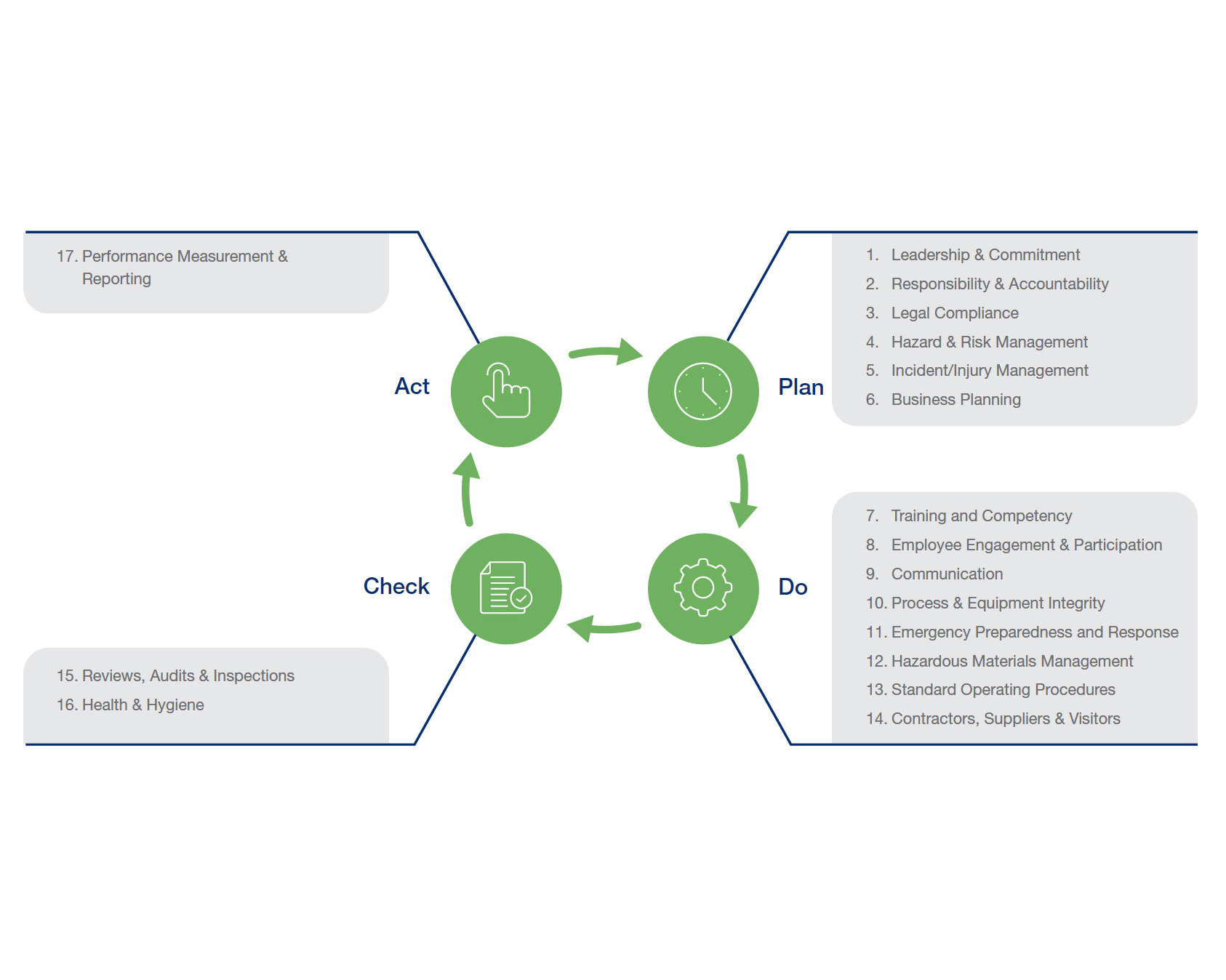 《健康及安全管理手册》的17项标准被安排在「计划 - 执行 - 检查 - 行动」框架内。